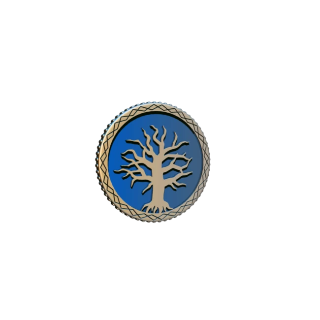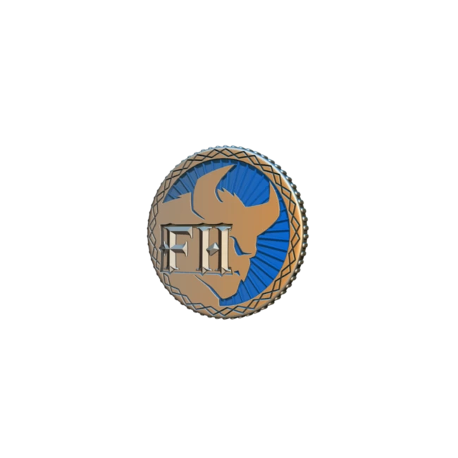 38mm metal coin with colored enamel highlights, featuring symbology and coloring from Frosthaven.