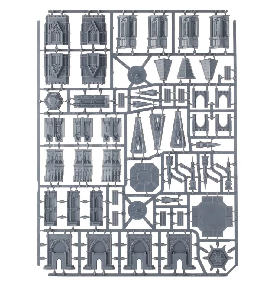 This set includes two plastic sprues, each of which can construct two complete buildings or be used to make a variety of larger or smaller structures. The 104 components are also cross-compatible with other Adeptus Titanicus Civitas Imperialis building kits to create a wider variety of scenery to use in your games.