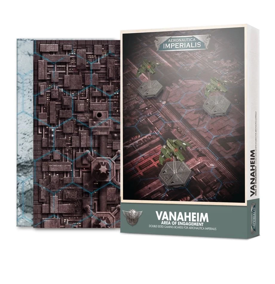 Each board depicts the dense industrial complex of Vanaheim’s orbital hives on one side, while the other shows the frozen canyons of the Manufactorum Beta-X15A, deep enough to swallow any fallen aircraft – two key warzones in the battles for Vanaheim detailed in the Warhammer: The Horus Heresy – Aeronautica Imperialis Rulebook. These boards each provide a rectangular gaming area of 19 hexes by 9 hexes, and can be combined to create a wide, square Area of Engagement, or an elongated Rolling Area of Engagement for aircraft to race above the terrain of Vanaheim.