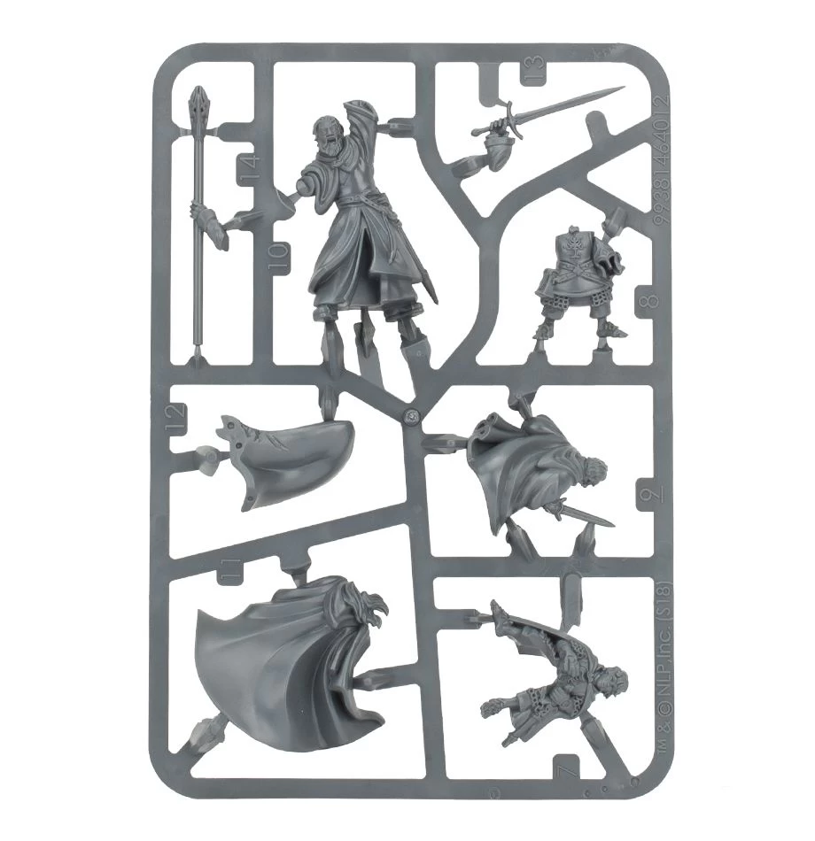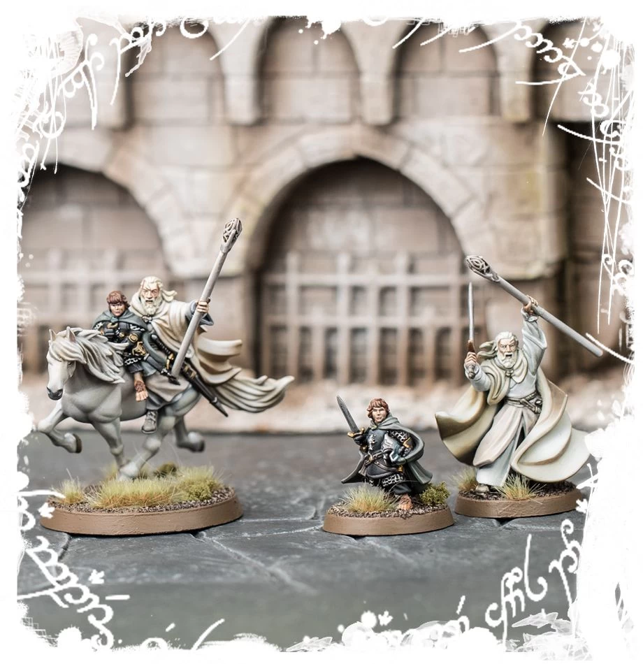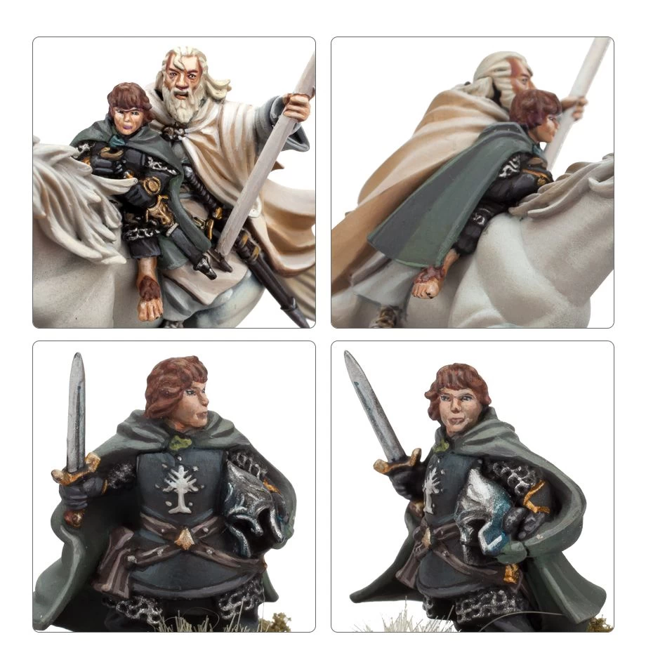 This multipart plastic kit contains the components necessary to assemble Gandalf the White and Peregrin Took, both on foot and mounted on Shadowfax. When mounted, you have the option to remove Peregrin Took, leaving just Gandalf on Shadowfax. On foot, Gandalf wields Glamdring and his wizard’s staff, while Peregrin Took is clothed in the uniform of the Citadel Guard of Minas Tirith with his helmet in his left hand.