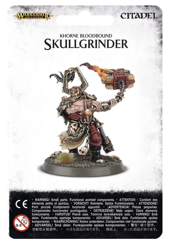 Utterly terrifying warrior-smiths who, legends say, simply appeared out of nowhere, striding from the wilderness with a psychotic gleam in their eyes, the Skullgrinders are hulking creatures that command awe even amongst the most lunatic of the Bloodbound. Wielding sacrificial, burning anvils at the end of long brass chains, their arcing, swinging attack bursts the heads of their opponents instantly, leaving nothing but a faint red mist and some shattered, splintered bone. Each skull dispatched in this way causes the the anvil to burn ever brighter, until the sheer heat melts enemy armour and roasts unfortunate flesh.