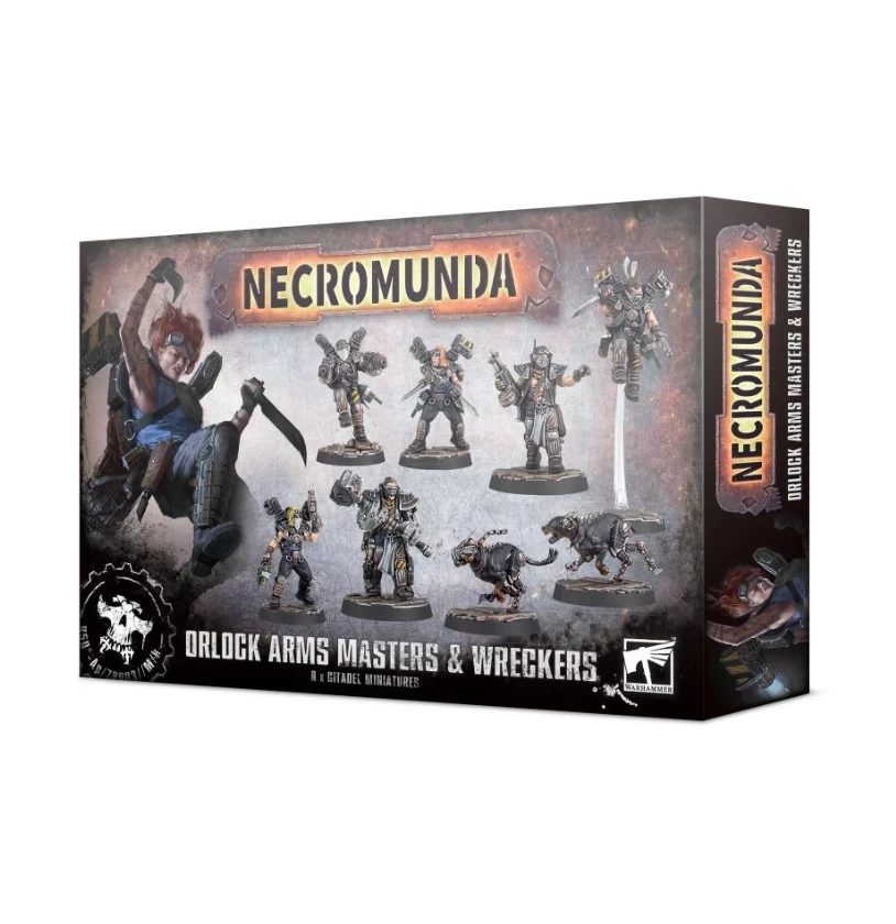 Expand your Orlock gang with these six fighters alongside their faithful and deadly cyber companions. The Wreckers are armed with a selection of pistols, knives, and demolition charges. They come with a groove stem so that they can be assembled to give the impression that they are airborne. Either Arms Master can be armed with a combat shotgun, or they can don a full servo harness and carry a deadly arc hammer into battle. Both Cyber-mastiffs are modelled running forward, hunting down their underhive prey.