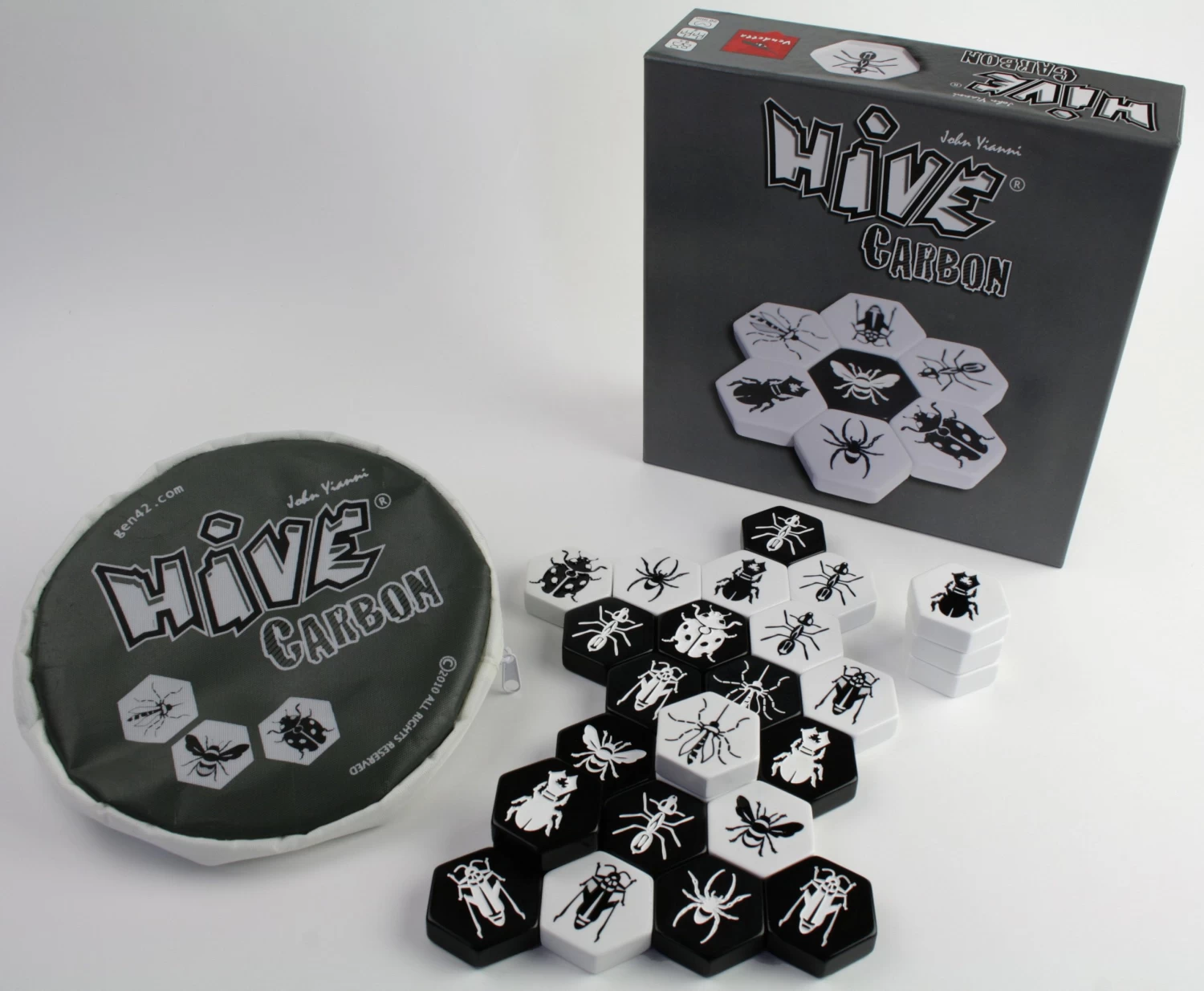 We are proud to announce the special edition Hive Carbon. This game is still the same as our award winning flagship Hive game, but with a Carbon twist which is an alternative to the existing set of pieces for those who prefer a classic black and white color scheme. Included with this edition will be the infamous mosquito piece an a very special ladybug piece.