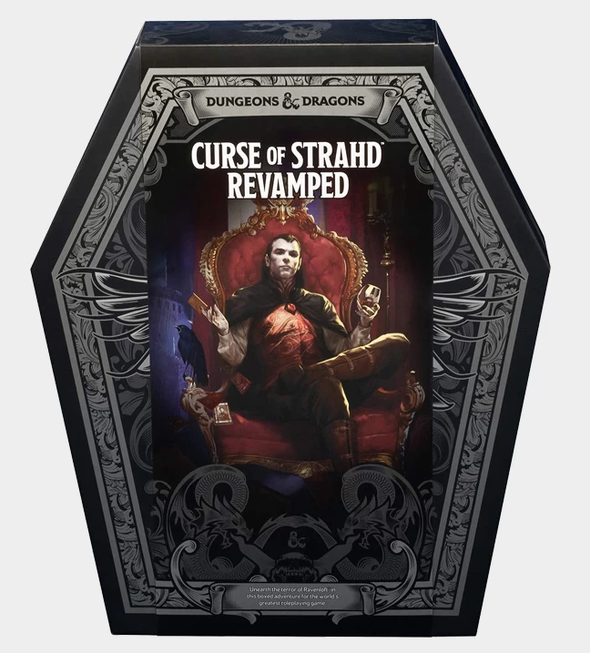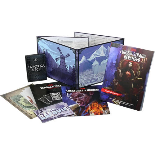 • Curse of Strahd, one of the most popular Dungeons & Dragons roleplaying game products of all time, split into three parts: a 224-page perfect-bound adventure for characters of levels 1–10, a 20-page Creatures of Horror booklet of new monsters that appear in the adventure, and an 8-page Tarokka Deck booklet.