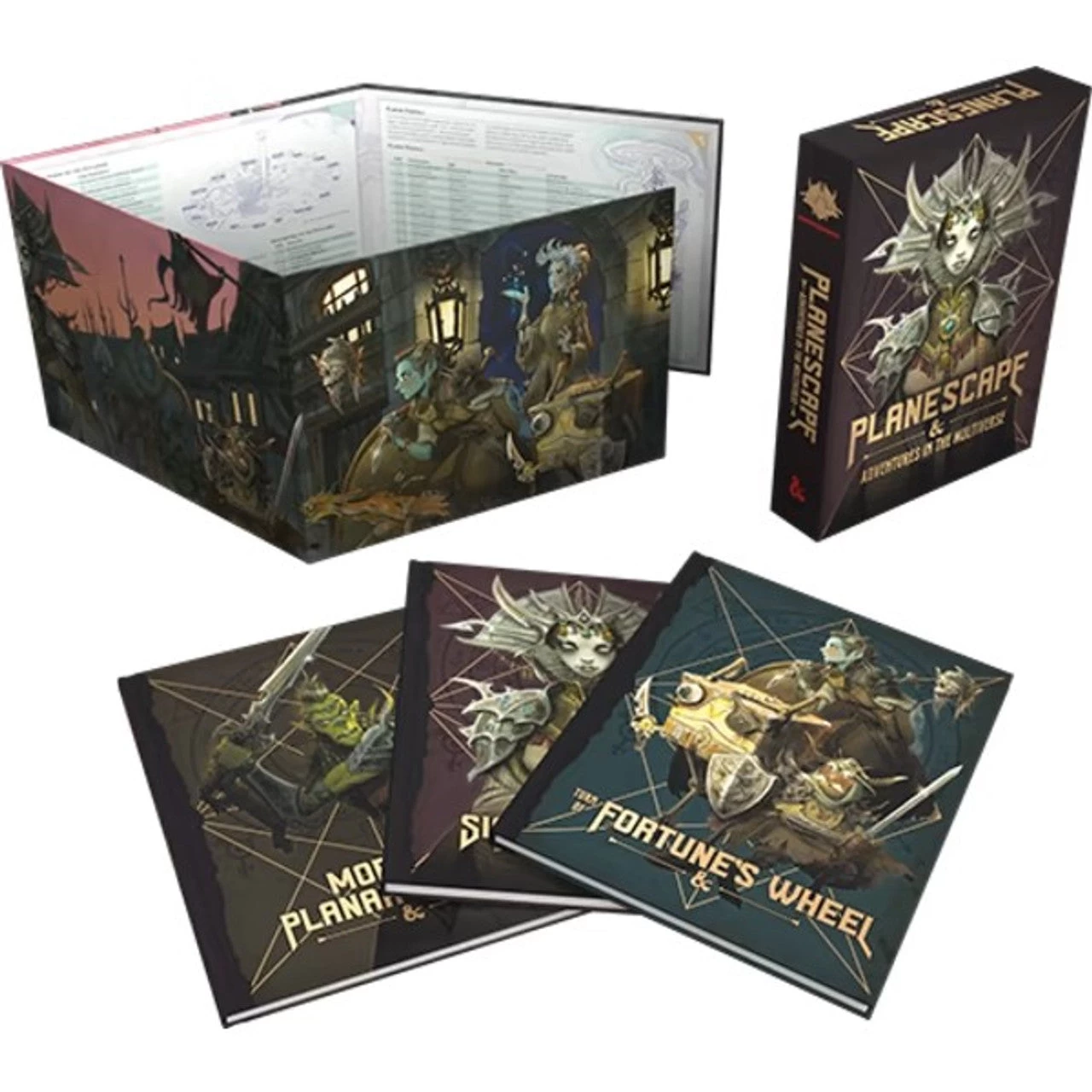 - Turn of Fortune’s Wheel (96-page hardcover adventure)—An adventure set in Sigil and the Outlands designed for characters levels 3–10 with a jump to level 17